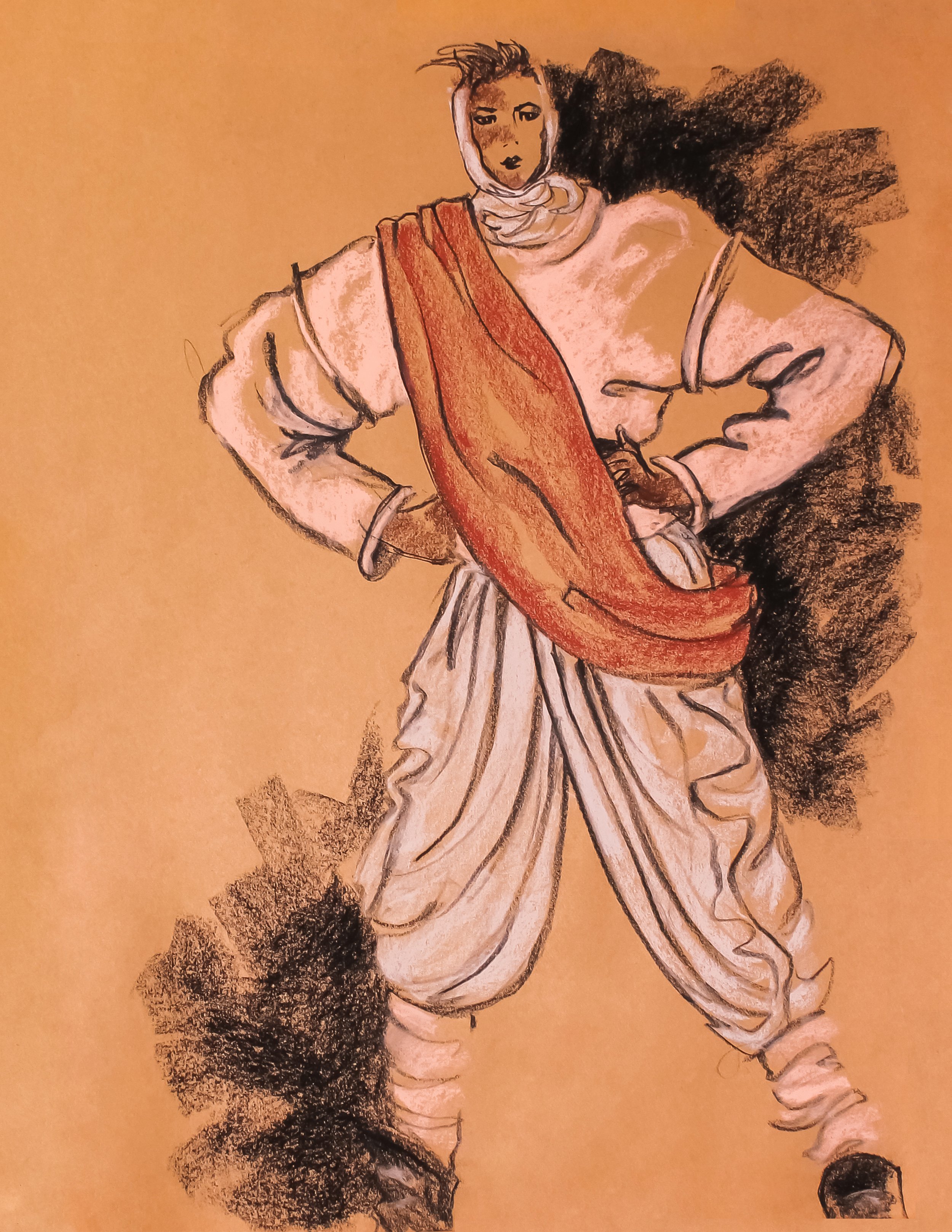Fashion Illustration Print: Vintage Black & White Charcoal & Conte Winter Outerwear w/Sash Front View Sketch on Brown Background (PNG Download)